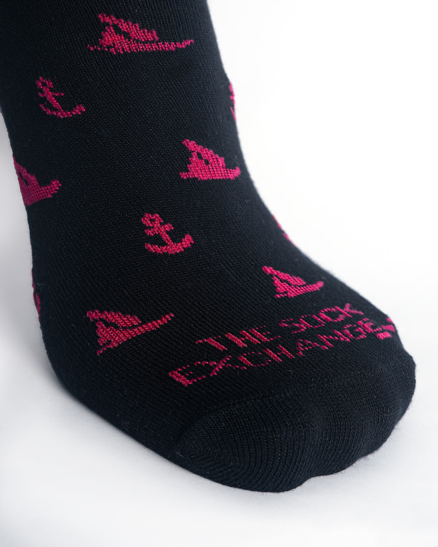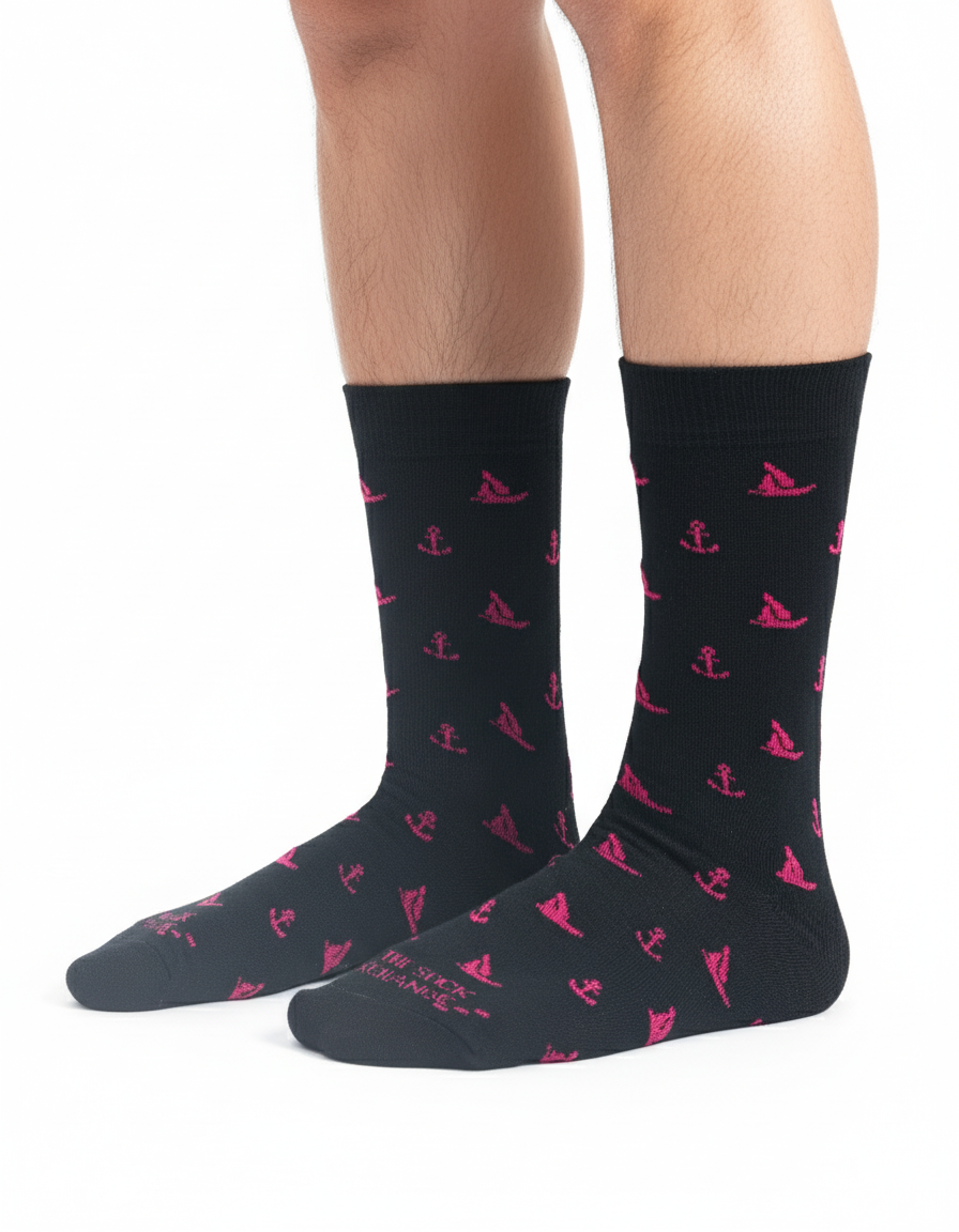 Set sail in style with Captain’s Crest Bamboo Socks, where modern sophistication meets maritime heritage. Made from luxurious bamboo viscose, these full-crew, non-terry socks offer unmatched softness, breathability, and durability. The design features refined nautical embroidery — a ship in full sail and an anchor at the cuff — symbolizing adventure and stability. Naturally moisture-wicking, eco-friendly, and hypoallergenic, they ensure all-day comfort and elegance under any formal ensemble.