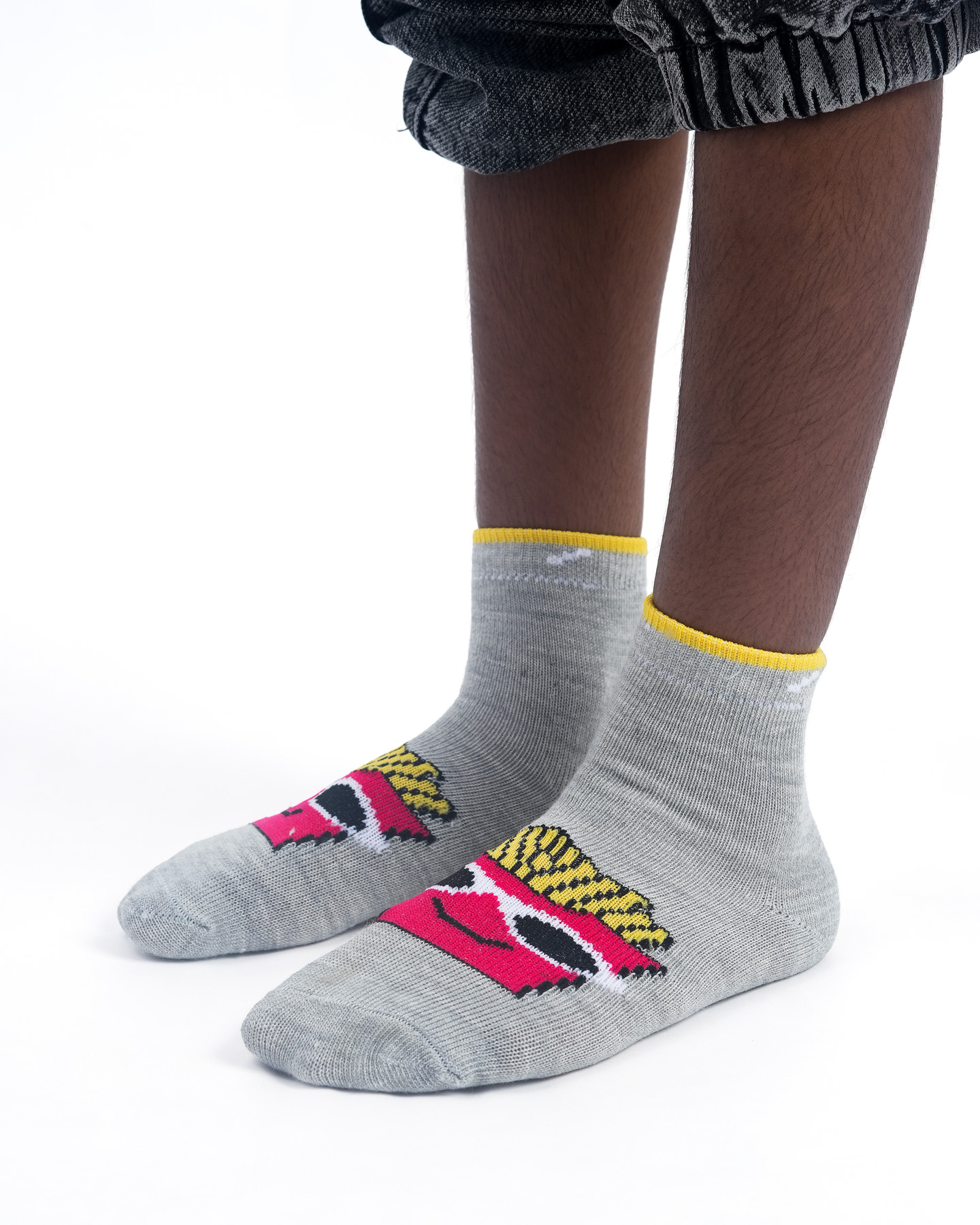 Turn up the fun with Fry Guy Cool Club socks—where golden fries meet playground cool! Featuring a smiling fries box in shades on a charcoal-grey base, these socks bring snack-time energy to every step.