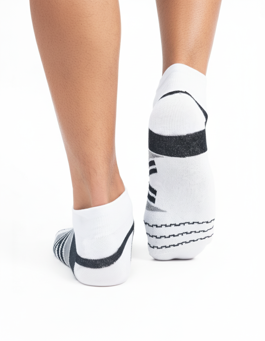 Push your limits with StrideX Pro Athletic Socks, designed for men who demand power, precision, and endurance. Featuring advanced third heel grip technology for superior traction and anti-blister protection for lasting comfort, these ankle-length socks deliver unmatched stability during high-speed movement. The ultra-light, non-terry construction keeps feet cool and sweat-free, while the ankle-length precision fit offers just the right amount of compression, enhancing circulation and stability without restricting flexibility. An elastic cuff that doesn’t slip ensures a secure fit through every stride. With a bold, futuristic design inspired by speed and motion, StrideX Pro blends athletic performance with modern style—perfect for running, training, and intense sports.